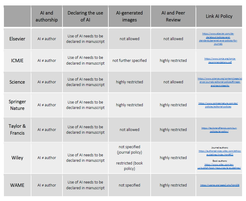 The following overview provides a summary of AI policies of the major publishers and publishing associations (last update: October 2025)